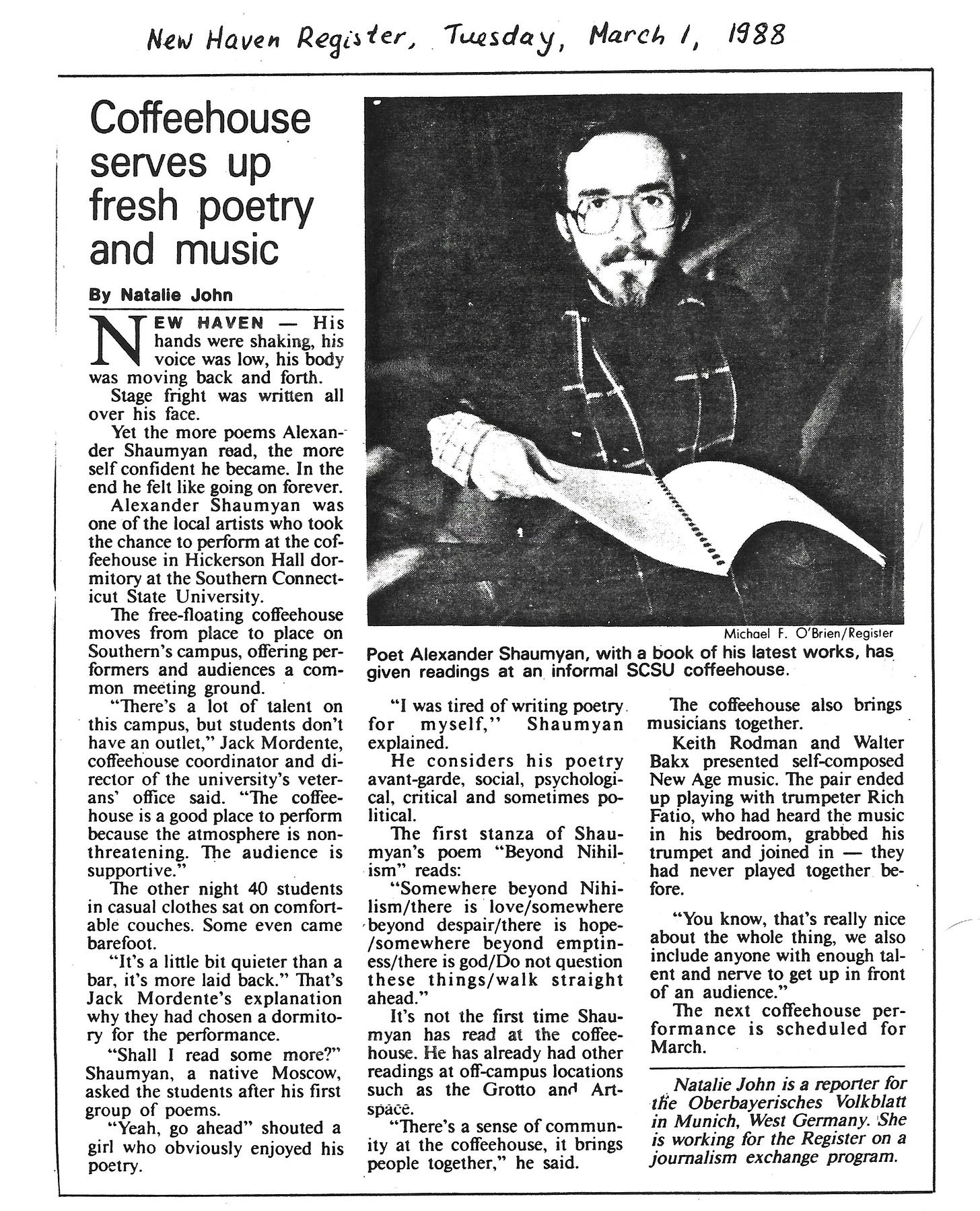 Freedom I long for liberation of my heart, To touch and feel and taste the gentle being, I long for spring, I long to be a part Of something greater, something beyond meaning. Beyond all words, beyond conceptions rise, I want to lose myself in the eternal, Beyond appearances, beyond all lies, Beyond external, and beyond internal. Neither security, nor life beyond I seek, I do not want to chase these apparitions, I want to breathe, I want to rise and speak The language of the sky for all to listen. And if you find me lying in my grave, I will me moss that covered up my coffin, From all confinements, all restrictions and all caves I will be free, I will be everything and nothing. --Alexander Shaumyan (c. 1986)